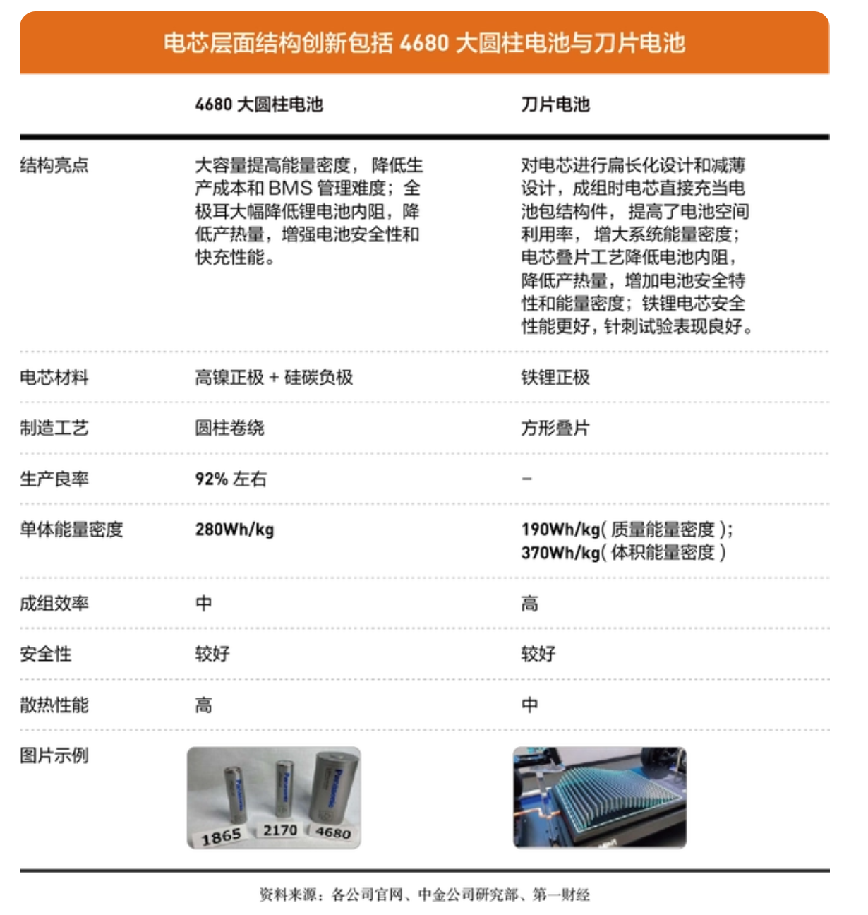 其中,較為成功的創(chuàng)新案例是比亞迪的刀片電池、特斯拉的4680大圓柱電池。