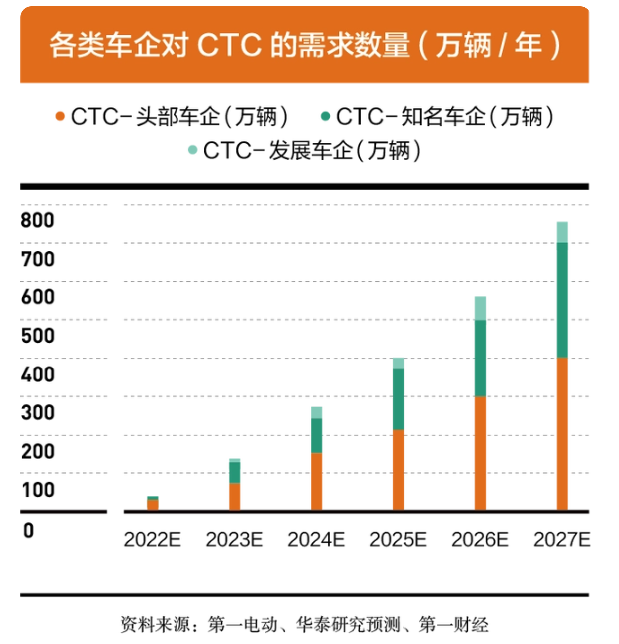 綜合來看,華泰證券認為CTC方案將不斷滲透,預(yù)計2025年各類車企對CTC的需求數(shù)量達400萬輛左右。