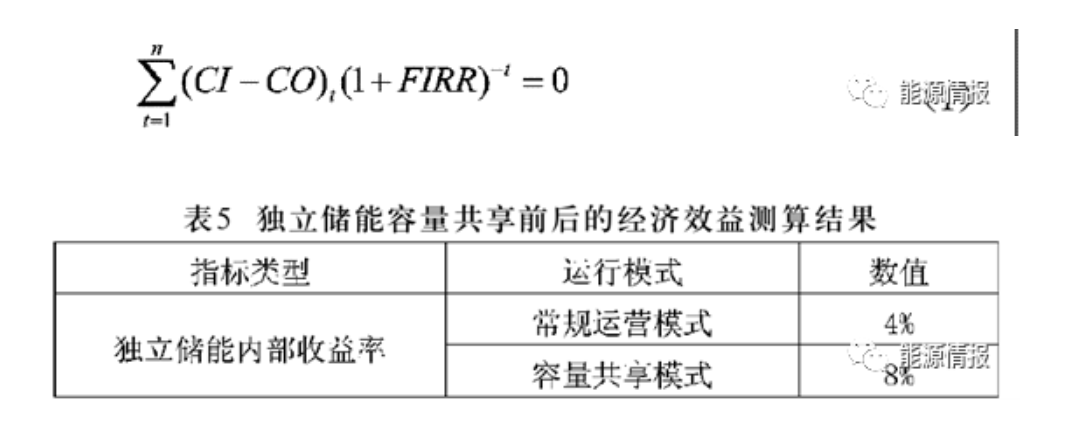 通過計算獨立儲能在常規(guī)運營和容量共享兩種模式下的內(nèi)部收益率評價其經(jīng)濟性,計算公式如式(1)所示,計算結(jié)果如表5所示。