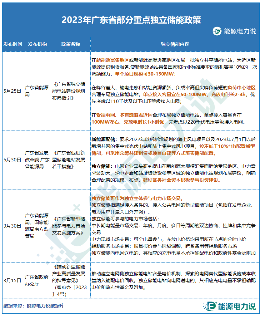 2023年3-5月期間,廣東新型儲能重磅政策密集出臺,多個政策將獨立儲能列入規(guī)劃重點。