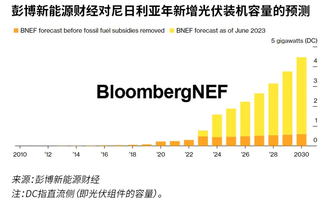 彭博新能源財經(jīng)預(yù)計到2030年尼日利亞的累計光伏裝機(jī)容量,目前為約1GW