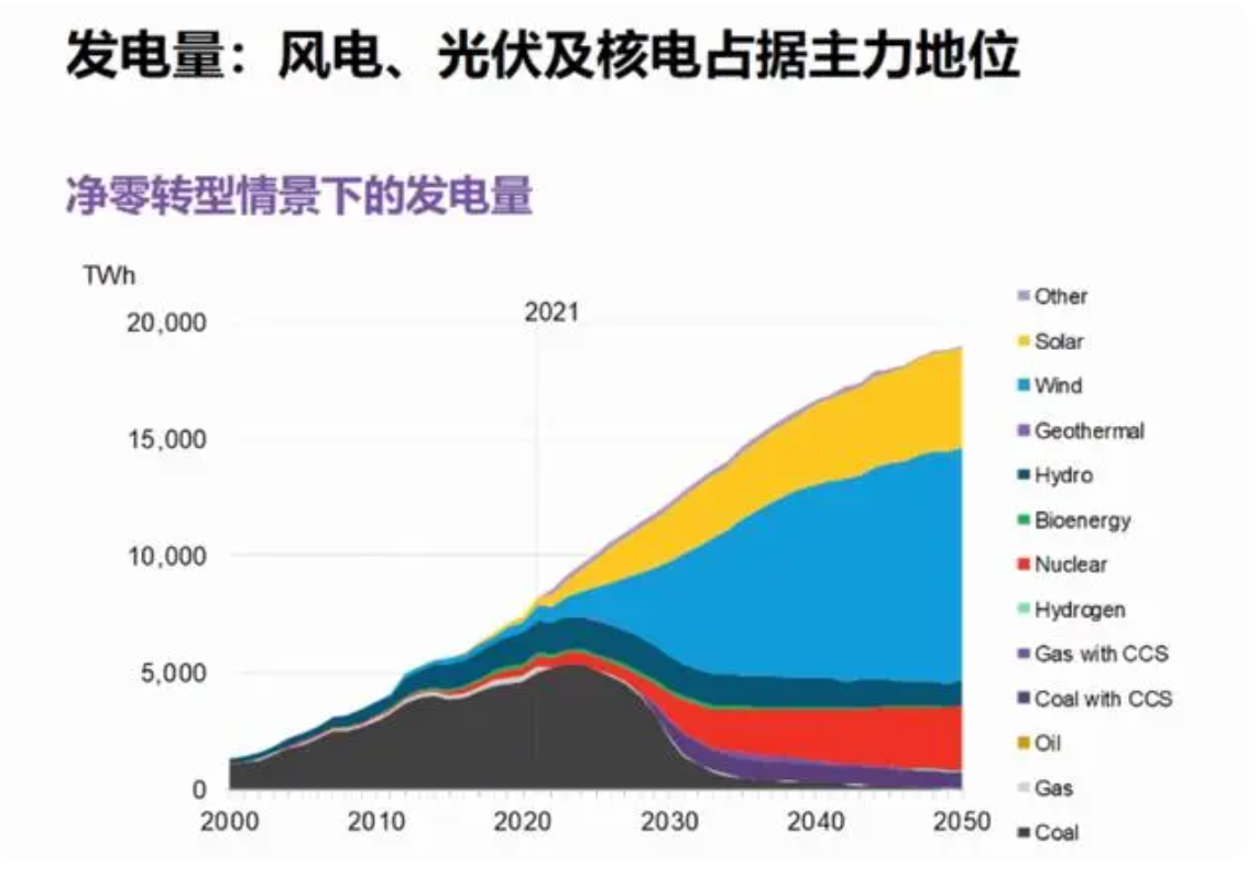 本文插圖均來自彭博新能源財經(jīng)。圖中占比最大的深淺兩種藍(lán)色色塊與兩種黃色色塊分別代表風(fēng)電和光伏發(fā)電的裝機量。凈零轉(zhuǎn)型情景更進一步,描述的是中國到2050年實現(xiàn)凈零排放的同時保證全球升溫不超過2攝氏度的減排路徑。在該情景中,中國的光伏、風(fēng)電累計裝機容量屆時將超過67億千瓦,相比2022年的8億千瓦實現(xiàn)大幅飛躍。同時需要3.5億千瓦的核電裝機容量,同樣大幅高于2022年的5700萬千瓦。風(fēng)電、光伏和核電成為未來新型電力系統(tǒng)的主力電源,電池儲能、氫能的增速也較基礎(chǔ)情景更快。從發(fā)電量維度看,到2050年,大多數(shù)發(fā)電量來自風(fēng)電和光伏發(fā)電,兩者在凈零轉(zhuǎn)型情景的整體電量供應(yīng)占比達75%。分開看,由于風(fēng)電的利用小時數(shù)更高,發(fā)電量占比將達到52%,光伏占23%;核電將貢獻14%的發(fā)電量;剩余部分主要由配建CCS技術(shù)的燃煤電廠來滿足,作為新能源出力下降時保障電力系統(tǒng)安全穩(wěn)定運行的靈活性調(diào)節(jié)電源。