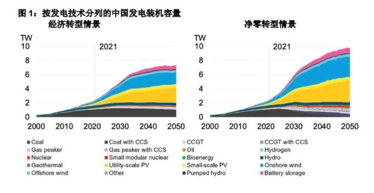 作為最大的發(fā)展中國家,中國將用30年左右時間來完成全球最高碳排放強度降幅,以全球歷史上最短的時間實現(xiàn)從碳達峰到碳中和。能源貫穿經(jīng)濟社會發(fā)展的全過程、各環(huán)節(jié),是實現(xiàn)“雙碳”目標(biāo)的關(guān)鍵領(lǐng)域。上述報告詳細(xì)描述了中國能源系統(tǒng)的兩種轉(zhuǎn)型情景及其對中國能源安全的影響。無論是基礎(chǔ)的經(jīng)濟轉(zhuǎn)型情景(假設(shè)除現(xiàn)有政策外不再推出新的政策措施)還是凈零轉(zhuǎn)型情景下,到2050年,光伏和風(fēng)電都將成為中國電力系統(tǒng)的主力。