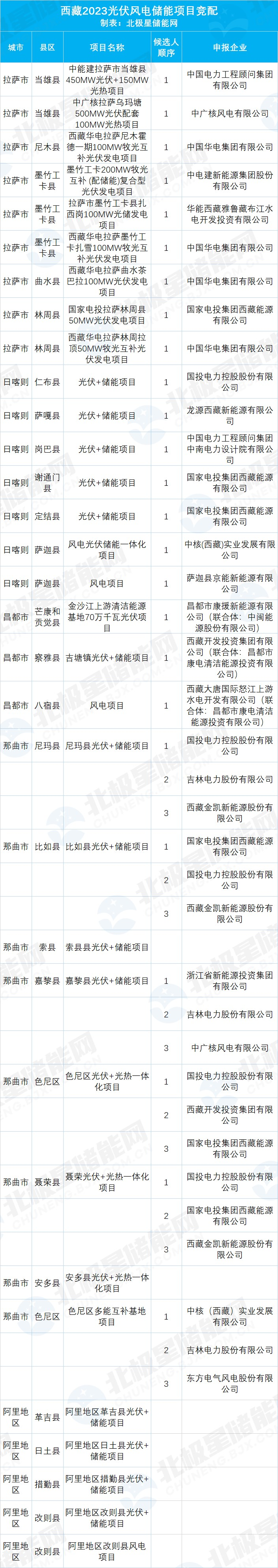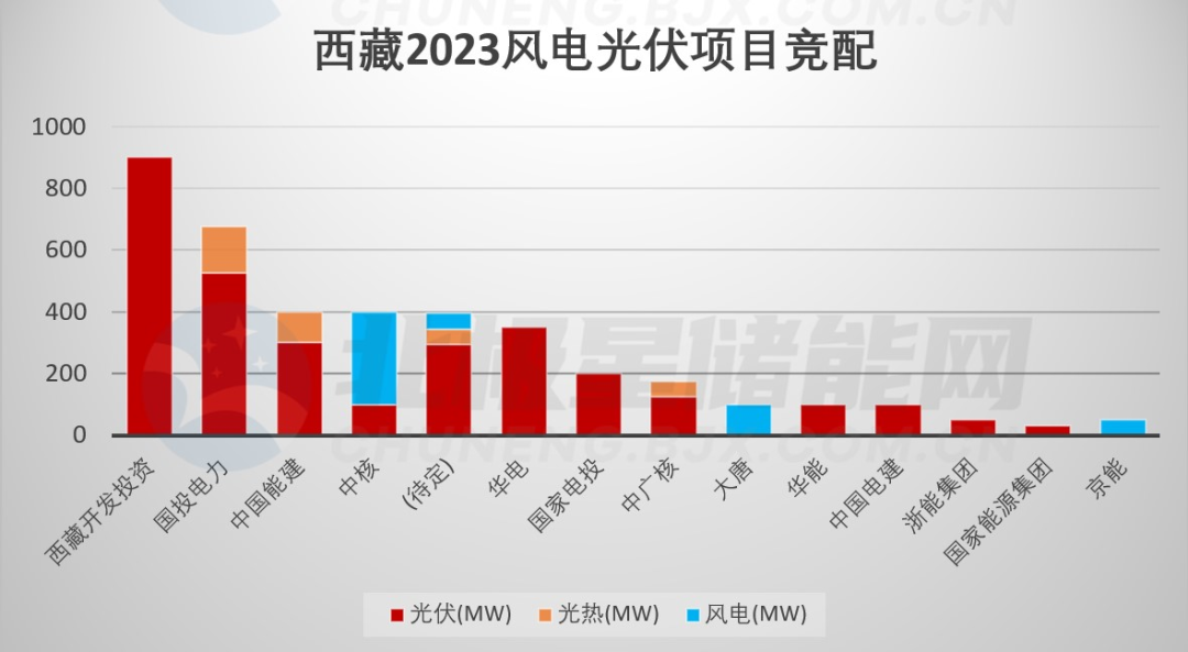近日,西藏2023年風電光伏項目競配結(jié)果陸續(xù)公布,已有超3.5GW光伏風電項目投資單位塵埃落定。其中西藏開發(fā)投資集團擁有新能源項目規(guī)模最為龐大,預計超過900MW,而響應的配套儲能需求預計達180MW/720MWh,其次國投電力新能源項目最多達675MW,隨后央國企包括華電、中國能建、國家電投、中廣核、中核、大唐、華能、中國電建、浙能集團、國家能源集團、京能等。