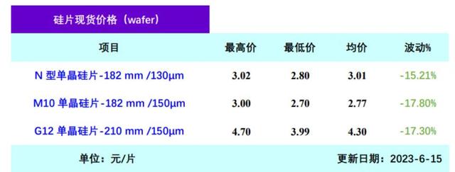 6月15日,硅業(yè)分會(huì)也發(fā)布了單晶硅片的價(jià)格,其中,N型單晶硅片-182mm/130um成交價(jià)格在2.80/片-3.02元/片之間,成交均價(jià)3.01元/片,周環(huán)比跌幅15.21%。