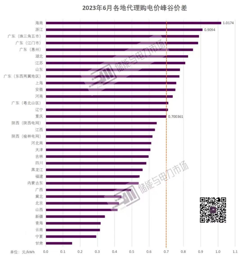 峰谷電價(jià)的調(diào)整給了分布式儲(chǔ)能更大的套利空間,浙江、湖南、湖北、上海、安徽、廣東、海南等多省市已可滿足工商業(yè)儲(chǔ)能每天兩充兩放。根據(jù)儲(chǔ)能與電力市場(chǎng)相關(guān)數(shù)據(jù)顯示,今年6月國(guó)網(wǎng)區(qū)域峰谷價(jià)差超0.7元/kWh的區(qū)域15個(gè),近5成的區(qū)域峰谷價(jià)差同比增長(zhǎng)。