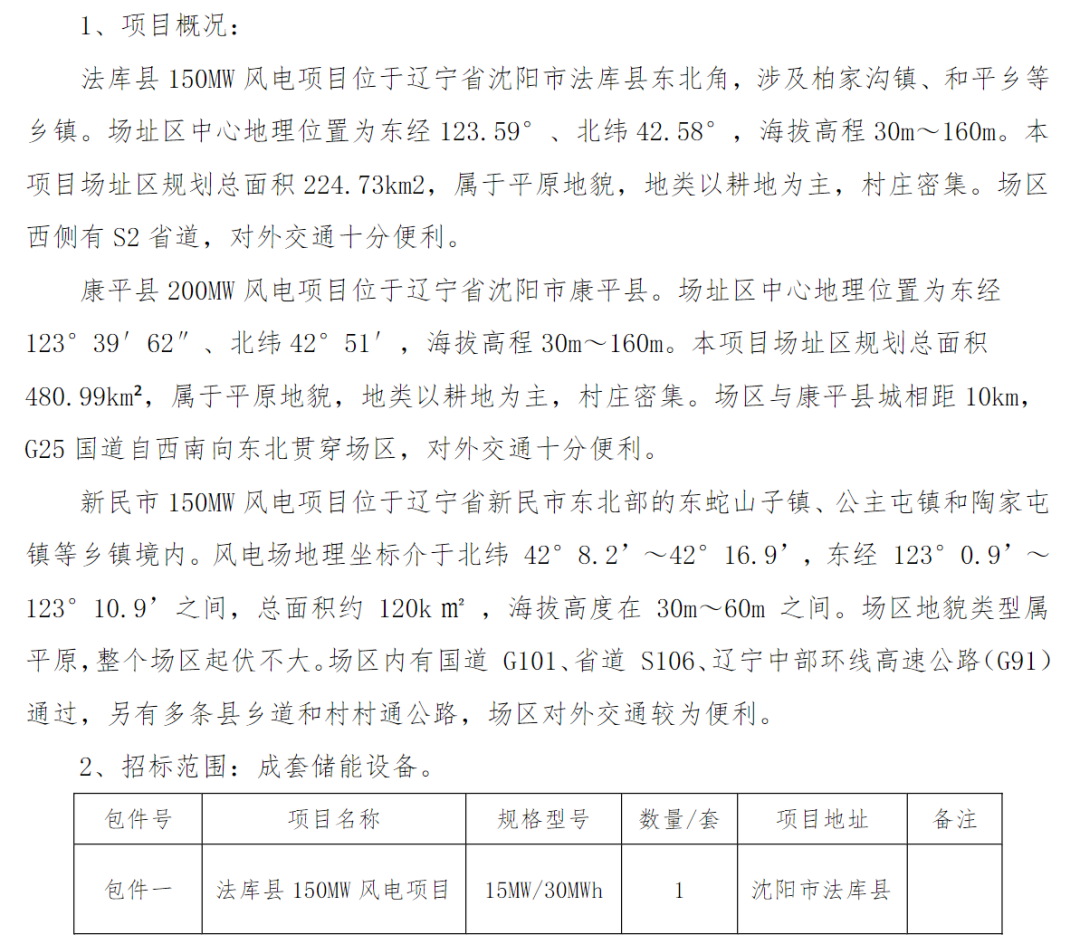 法庫縣150MW風(fēng)電項(xiàng)目配建儲能15MW/30MWh