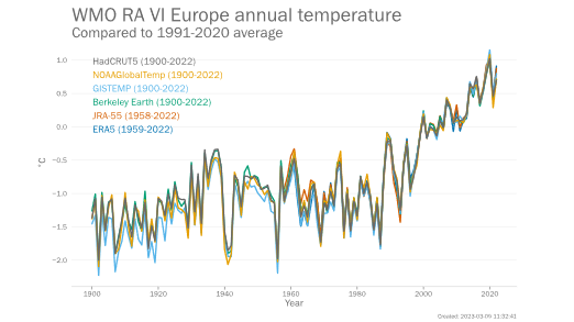 報(bào)告顯示,自20世紀(jì)80年代以來(lái),歐洲的變暖幅度是全球平均水平的兩倍,對(duì)該地區(qū)的社會(huì)經(jīng)濟(jì)結(jié)構(gòu)和生態(tài)系統(tǒng)產(chǎn)生了深遠(yuǎn)的影響。2022年,歐洲比工業(yè)化前(1850-1900年)的平均值高出約2.3℃,該平均值通常被用作《巴黎協(xié)定》的基線。