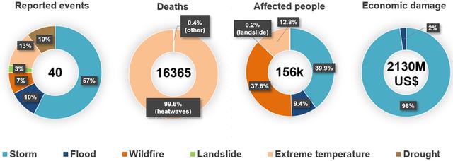 其中,大約67%的事件是與洪水和風(fēng)暴有關(guān)的,占總經(jīng)濟(jì)損失的大部分,約20億美元。就死亡率而言,更嚴(yán)重的原因是熱浪,據(jù)報(bào)道,熱浪導(dǎo)致了16000多人的死亡。
