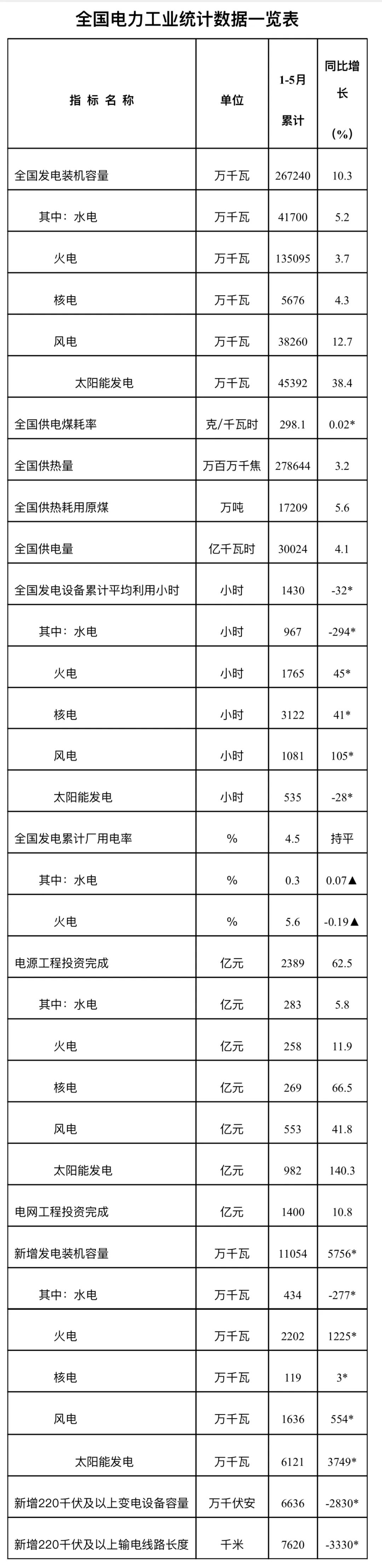 1-5月份,全國(guó)發(fā)電設(shè)備累計(jì)平均利用1430小時(shí),比上年同期減少32小時(shí)。其中,水電967小時(shí),比上年同期減少294小時(shí);太陽(yáng)能發(fā)電535小時(shí),比上年同期減少28小時(shí);風(fēng)電1081小時(shí),比上年同期增加105小時(shí);火電1765小時(shí),比上年同期增加45小時(shí);核電3122小時(shí),比上年同期增加41小時(shí)。