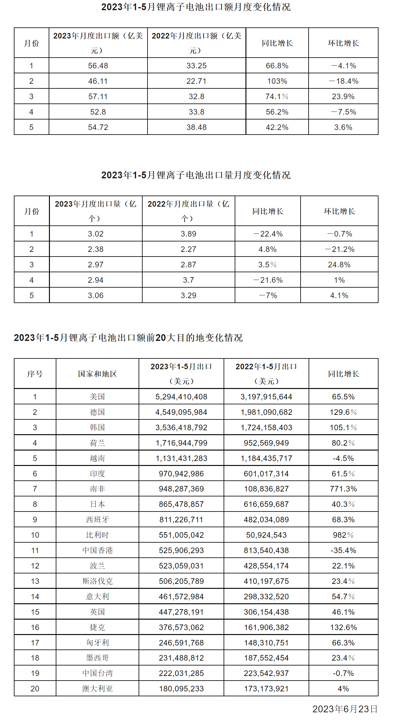 中國(guó)儲(chǔ)能網(wǎng)訊:2023年1-5月我國(guó)鋰離子電池累積出口額為267.15億美元,2022年同期為161.04億美元,同比增長(zhǎng)65.9%;2023年1-5月鋰離子電池累積出口數(shù)量為14.36億個(gè),2022年同期為16.02億個(gè),同比減少10.4%。其中,2023年5月鋰離子電池出口額為54.72億美元,同比增長(zhǎng)42.2%,環(huán)比增長(zhǎng)3.6%;2023年5月鋰離子電池出口數(shù)量為3.06億個(gè),同比減少7%,環(huán)比增長(zhǎng)4.1%。