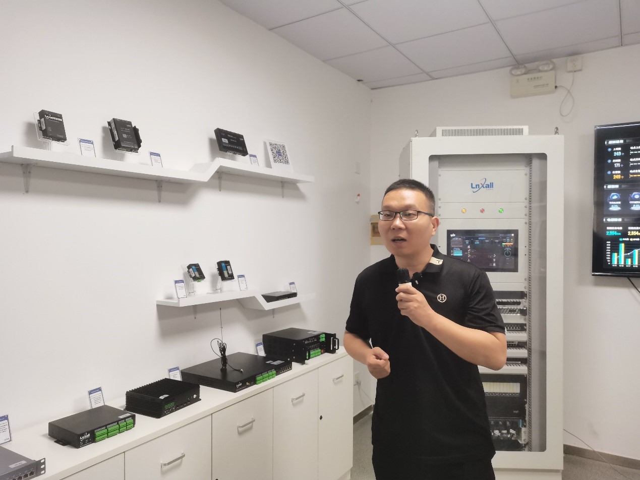 在簡捷物聯(lián)展廳,王雷雷向?qū)<医M一行介紹了能量管理系統(tǒng)(EMS)、站控能量柜、戶用儲能數(shù)采設(shè)備及云平臺、移動換電電池管理系統(tǒng)等核心產(chǎn)品,以及企業(yè)所獲得的榮譽(yù)。