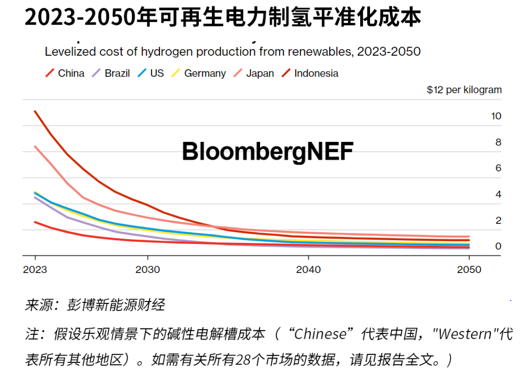 到2035年,超過90%的市場中綠氫要比新建灰氫便宜。到2030年,在巴西、中國、瑞典、西班牙和印度,新建綠氫工廠已經(jīng)比繼續(xù)運(yùn)營現(xiàn)有的灰氫工廠便宜。到2050年,在所有建模市場中新建綠氫的平準(zhǔn)化成本將低于現(xiàn)有灰氫工廠的邊際成本。