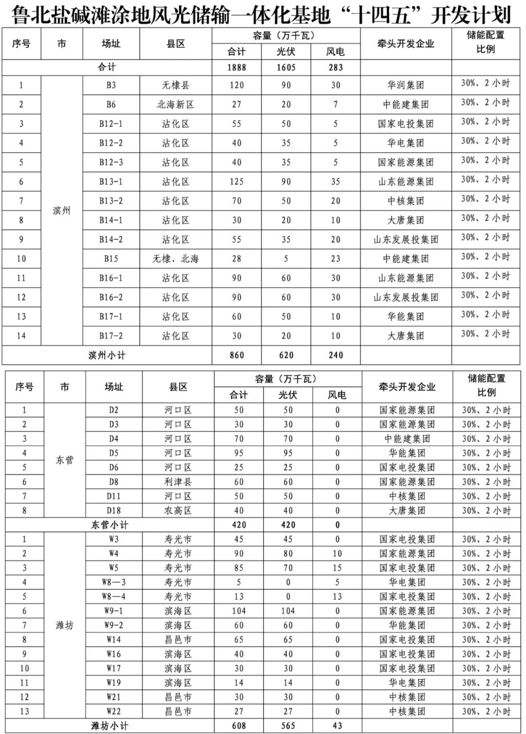 魯北基地總裝機(jī)容量48GW,其中,光伏發(fā)電44GW、風(fēng)電4GW。濰坊納入基地裝機(jī)規(guī)模15.32GW,其中,風(fēng)電0.82GW,光伏發(fā)電14.50GW。