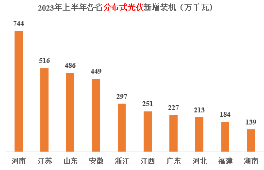 2023年上半年戶用裝機(jī)規(guī)模為2152萬(wàn)千瓦,前三的省份分別為:河南、山東、河北;前十省份合計(jì)1969萬(wàn)千瓦,占到全國(guó)新增光伏裝機(jī)的91%。新增光伏總裝機(jī)前十省份的具體情況如下圖所示。