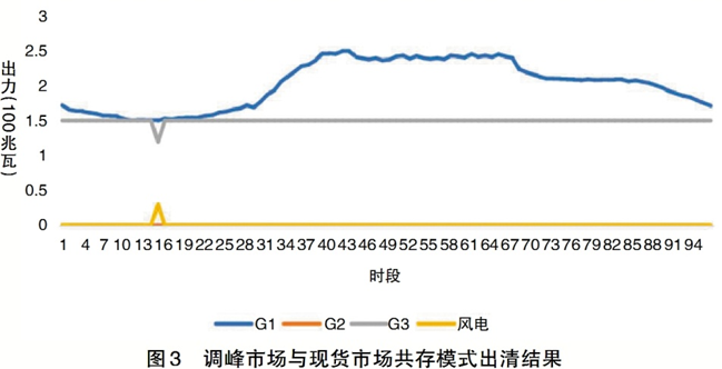 模式3:調(diào)峰市場(chǎng)與現(xiàn)貨市場(chǎng)共存模式。在該模式中,機(jī)組現(xiàn)貨市場(chǎng)報(bào)價(jià)首段出力限制為50%,50%~30%為深調(diào)峰市場(chǎng)競價(jià)部分,火電機(jī)組50%以下出力不得參與定價(jià),深調(diào)峰市場(chǎng)中標(biāo)機(jī)組在中標(biāo)時(shí)段設(shè)置為開機(jī),發(fā)電出力為現(xiàn)貨市場(chǎng)中中標(biāo)出力(若在現(xiàn)貨市場(chǎng)未中標(biāo),按照50%最大出力計(jì)算)減去調(diào)峰市場(chǎng)中標(biāo)的調(diào)峰出力。市場(chǎng)出清結(jié)果如圖3所示,G3會(huì)在15時(shí)段的深調(diào)市場(chǎng)中標(biāo)30兆瓦,所以在后續(xù)的電能量市場(chǎng)中被設(shè)置為開機(jī),且除去調(diào)峰中標(biāo)時(shí)段外其他時(shí)段出力均為50%的最大出力,導(dǎo)致G2只能處于停機(jī)狀態(tài),使得總發(fā)電成本進(jìn)一步上升。在調(diào)峰市場(chǎng)與現(xiàn)貨市場(chǎng)共存模式下,產(chǎn)生調(diào)峰費(fèi)用75萬元由風(fēng)電企業(yè)向G3機(jī)組進(jìn)行支付,用戶需要支付的發(fā)電總成本為240.64萬元,雖然解決了棄風(fēng)問題,但使得發(fā)電總成本上漲35.70萬元,扭曲了市場(chǎng)中電力的真正價(jià)格,引起用戶購電費(fèi)用的同步上漲。