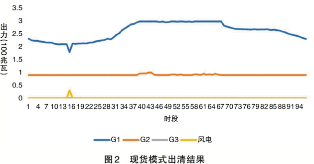模式2:現(xiàn)貨市場(chǎng)模式。在該模式中,不設(shè)置調(diào)峰市場(chǎng)且機(jī)組首段報(bào)價(jià)出力不受50%的限制,機(jī)組申報(bào)任何出力均可用于定價(jià),市場(chǎng)出清結(jié)果如圖2所示。由于機(jī)組均將最小出力30%作為報(bào)價(jià)首段,兩臺(tái)機(jī)組的最小出力和加上風(fēng)電出力小于系統(tǒng)低谷時(shí)的負(fù)荷,運(yùn)行G1和G2不會(huì)導(dǎo)致棄風(fēng)。而且相對(duì)成本較高的G2下調(diào)出力,為成本較低的G1留出了發(fā)電空間,進(jìn)一步降低了系統(tǒng)發(fā)電成本,在現(xiàn)貨模式下,用戶需支付的全天發(fā)電總成本為190.57萬元,在解決棄風(fēng)問題的同時(shí),相對(duì)模式1又降低了發(fā)電成本14.37萬元,釋放了社會(huì)福利并使得用戶購電費(fèi)用降低。