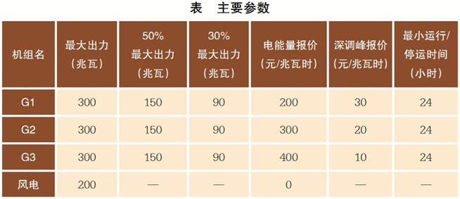 以下通過簡化模型進(jìn)行舉例說明。在該模型中,假定有三臺(tái)成本不同的火電機(jī)組與一臺(tái)風(fēng)機(jī),并模擬了一條典型負(fù)荷曲線,對(duì)不同市場(chǎng)模式的優(yōu)化結(jié)果進(jìn)行比對(duì)(見表所示)。