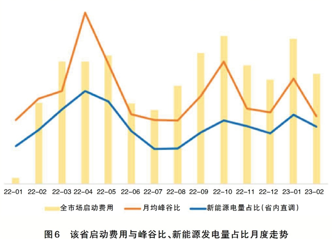 全年峰谷比分布與日前出清最低電價(jià)分布呈現(xiàn)出清晰的季節(jié)性差異,春秋兩季的峰谷差更大、出清負(fù)價(jià)更多,與新能源出力的季節(jié)性特征基本一致,并且這種一致性也體現(xiàn)在全市場(chǎng)啟動(dòng)費(fèi)用的月度走勢(shì)上。由此可見,新能源裝機(jī)尤其是光伏裝機(jī)的迅速增長(zhǎng)是導(dǎo)致煤機(jī)啟停更加頻繁的根本原因,新能源出力占比越高時(shí),省內(nèi)煤機(jī)的調(diào)峰壓力也會(huì)越大,進(jìn)而產(chǎn)生更多的啟動(dòng)費(fèi)用。