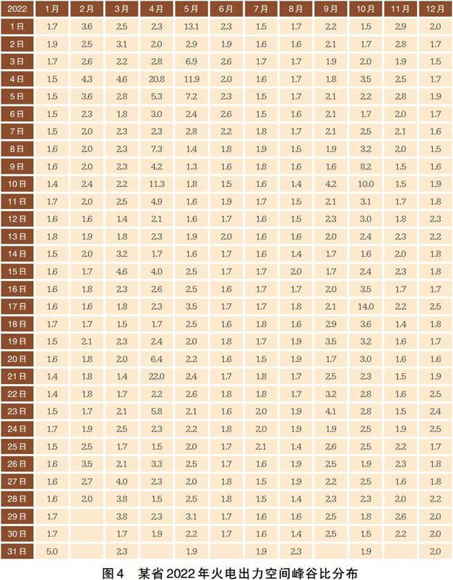 統(tǒng)計(jì)2022年全年每一天的市場(chǎng)化火電預(yù)測(cè)出力空間峰谷比數(shù)據(jù)(見圖4):峰谷比>2的天數(shù)達(dá)到了156天,約占全年的42.7%;>2.5的天數(shù)有67天,占全年的18.4%;>3的天數(shù)有42天,占全年的11.5%。一般而言,當(dāng)峰谷比>2時(shí)僅通過(guò)運(yùn)行機(jī)組調(diào)峰就有一定的困難了,當(dāng)峰谷比>2.5時(shí)肯定需要啟停調(diào)峰。粗略估計(jì),2022年全年大概有20%~40%的日期需要進(jìn)行啟停調(diào)峰。