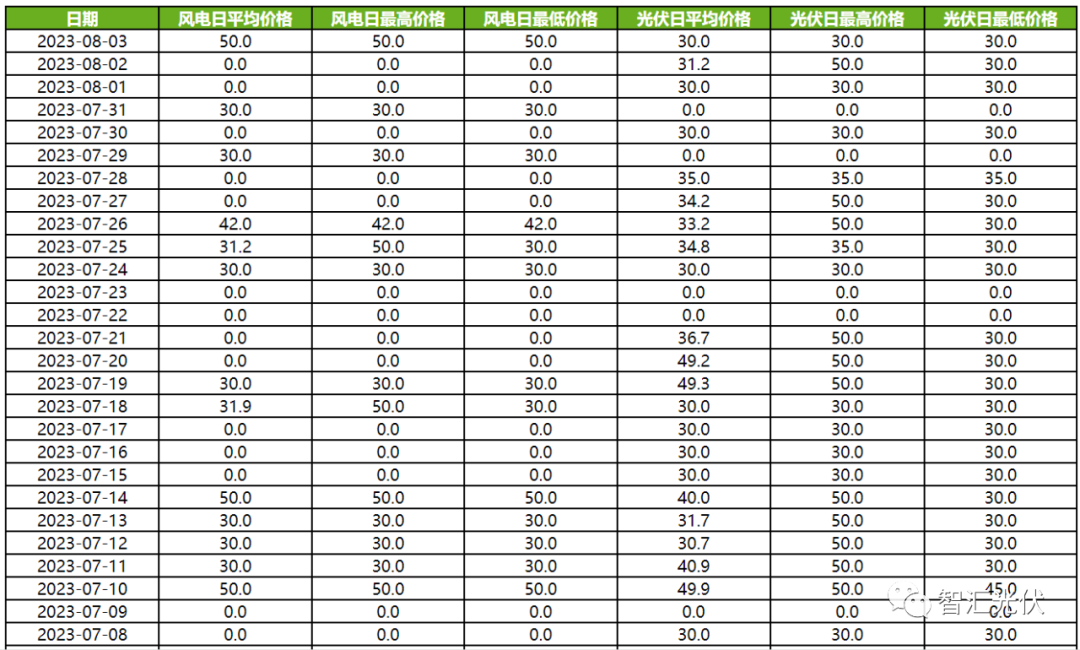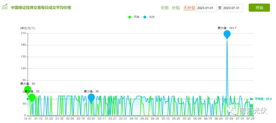 目前,風(fēng)電、光伏的無補(bǔ)貼綠證的交易價(jià)格集中在30~50元/張。2023年1~7月的平均交易價(jià)格為42.4元/張。如下圖所示。