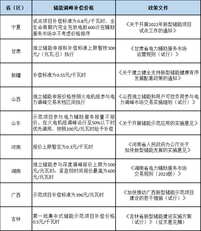 表3:部分?。▍^(qū))儲(chǔ)能調(diào)峰補(bǔ)償政策