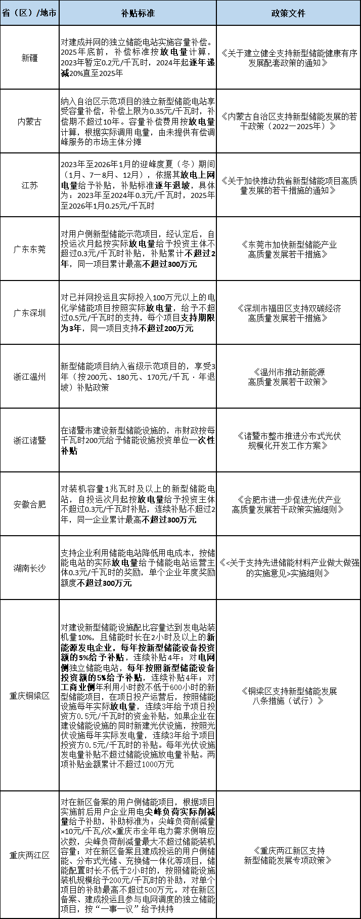 表2:部分地區(qū)儲(chǔ)能補(bǔ)貼政策