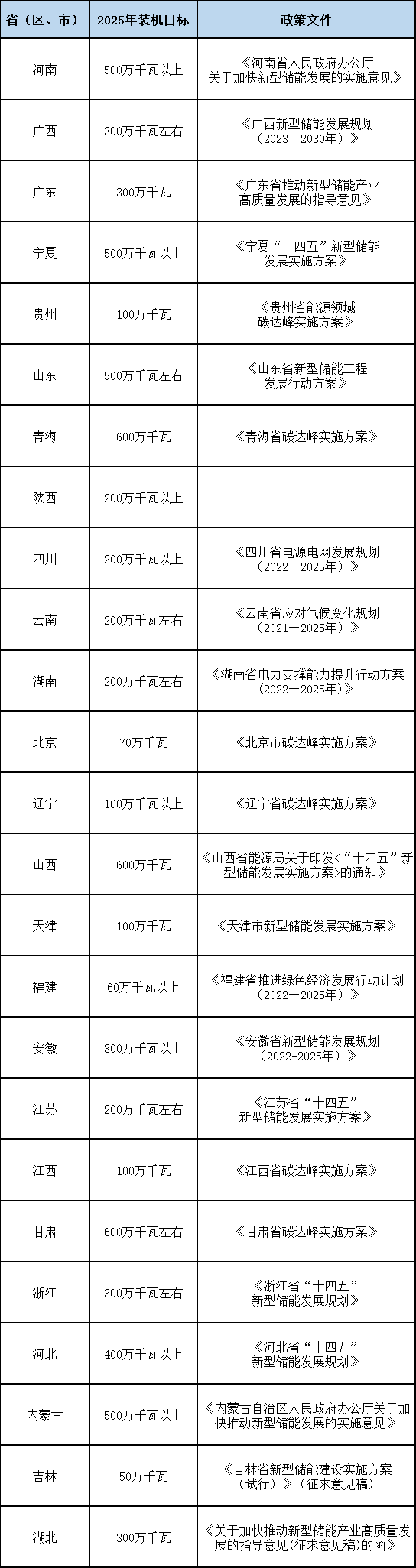 表1:25個(gè)?。▍^(qū)、市)“十四五”新型儲(chǔ)能裝機(jī)目標(biāo)
