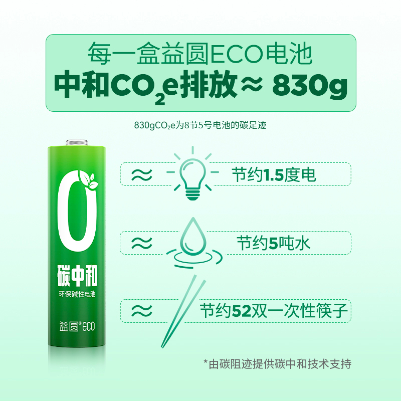 據(jù)碳阻跡統(tǒng)計(jì),每一盒(8節(jié))益圓ECO 5號(hào)電池中和二氧化碳當(dāng)量(CO2-e)排放約830克,這相當(dāng)于節(jié)約1.5度電,節(jié)約5噸水,節(jié)約52雙一次性筷子,也相當(dāng)于減少開(kāi)車(chē)出行4公里。