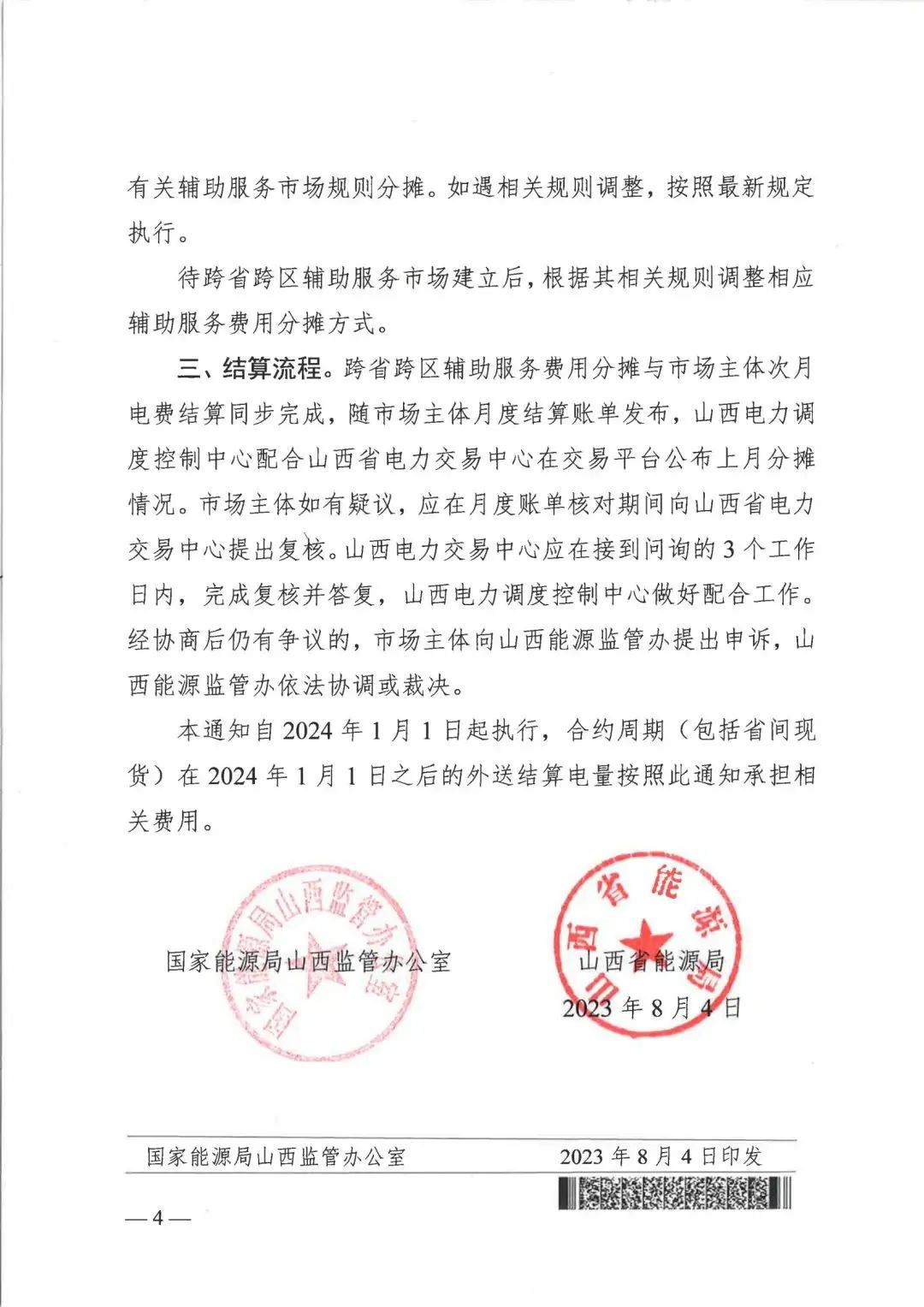 四是明確了執(zhí)行時間??紤]到山西省跨省跨區(qū)年度、多月中長期交易已完成,且本年度送京津唐政府間協(xié)議外送電量、電價均已確定,未包含受端省份應(yīng)承擔(dān)的輔助服務(wù)費(fèi)用,2023年內(nèi)執(zhí)行的話涉及到事后調(diào)整外送電量價值,對已成交外送電量的主體來說有失公平。為切實(shí)保障市場主體合理利益,通知明確合約周期(包括省間現(xiàn)貨)在2024年1月1日之后的外送結(jié)算電量按照此通知承擔(dān)相關(guān)費(fèi)用。