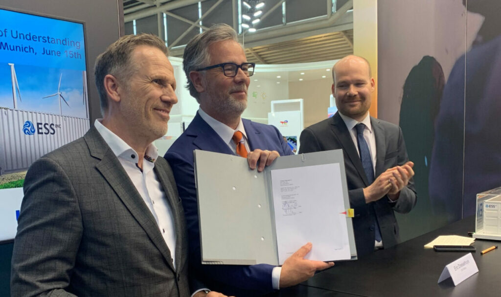 ESS公司首席執(zhí)行官Eric Dresselhuys(中)與LEAG公司的代表簽署協(xié)議