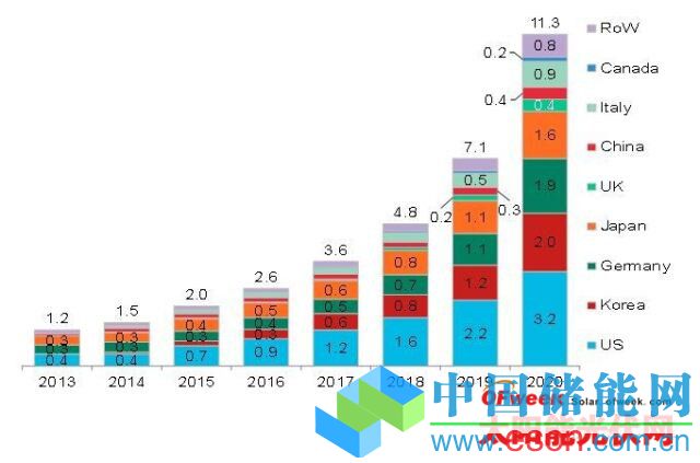 全球部分國家儲能系統(tǒng)累計安裝量預(yù)測,2013-2020年(GW)