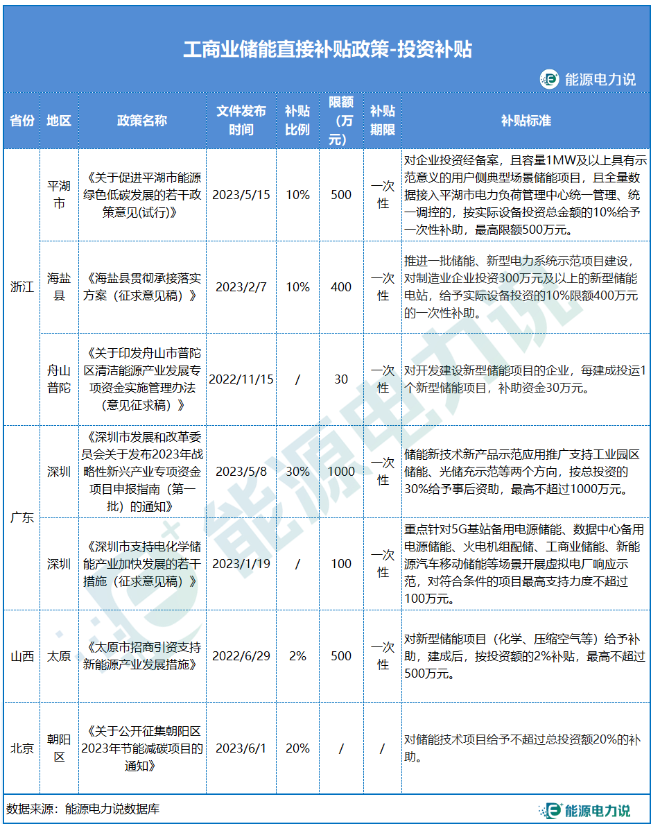 在投資補貼方面,今年浙江、廣東、北京等多省地區(qū)出臺了儲能投資補貼政策,投資補貼比例在2%-20%之間,單個項目補貼限額在30-1000萬元之間,補貼期限多為一次性補貼。其中今年5月深圳發(fā)布的《深圳市發(fā)展和改革委員會關(guān)于發(fā)布2023年戰(zhàn)略性新興產(chǎn)業(yè)專項資金項目申報指南(第一批)的通知》中補貼力度一騎絕塵,提出儲能新技術(shù)新產(chǎn)品示范應(yīng)用推廣支持工業(yè)園區(qū)儲能、光儲充示范等兩個方向,按總投資的30%給予事后資助,最高補貼1000萬元。