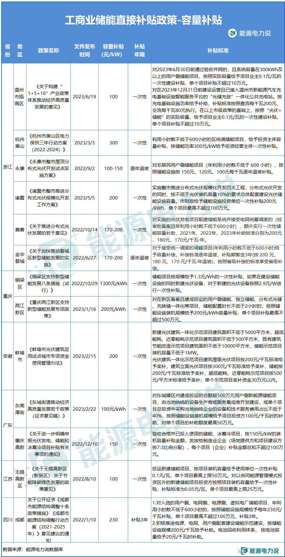 在容量補貼方面,今年浙江、重慶、安徽、廣東等多省地區(qū)出臺了儲能容量直接補貼政策;在2022至今各地發(fā)布的工商業(yè)儲能補貼政策中,整體補貼標(biāo)準(zhǔn)在100-300元/kW之間;補貼年限方面包括一次性補貼,三年逐年退坡補貼。浙江永康、嘉善、金華婺城采用逐年退坡補貼方式,補貼標(biāo)準(zhǔn)在100-200元/kW/年。