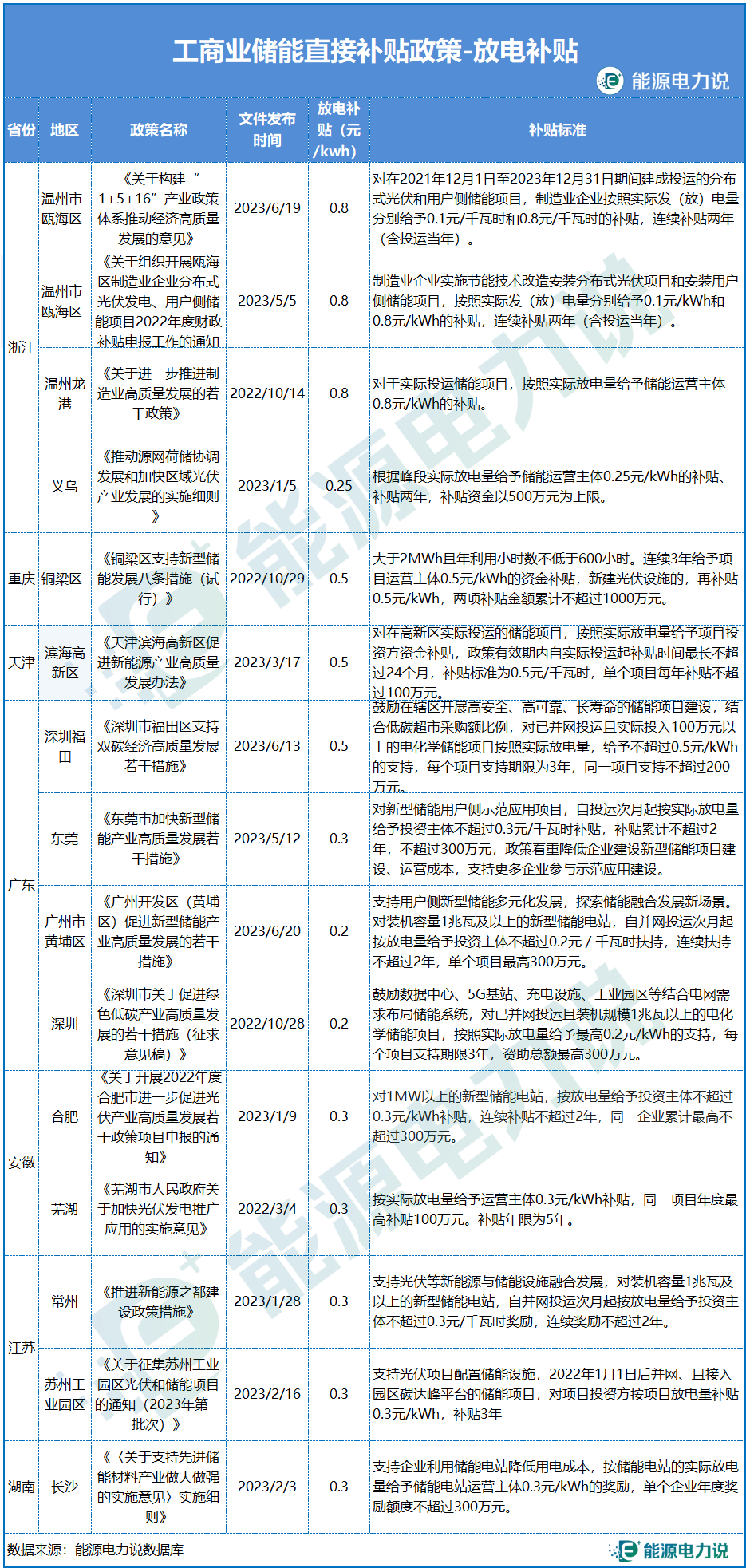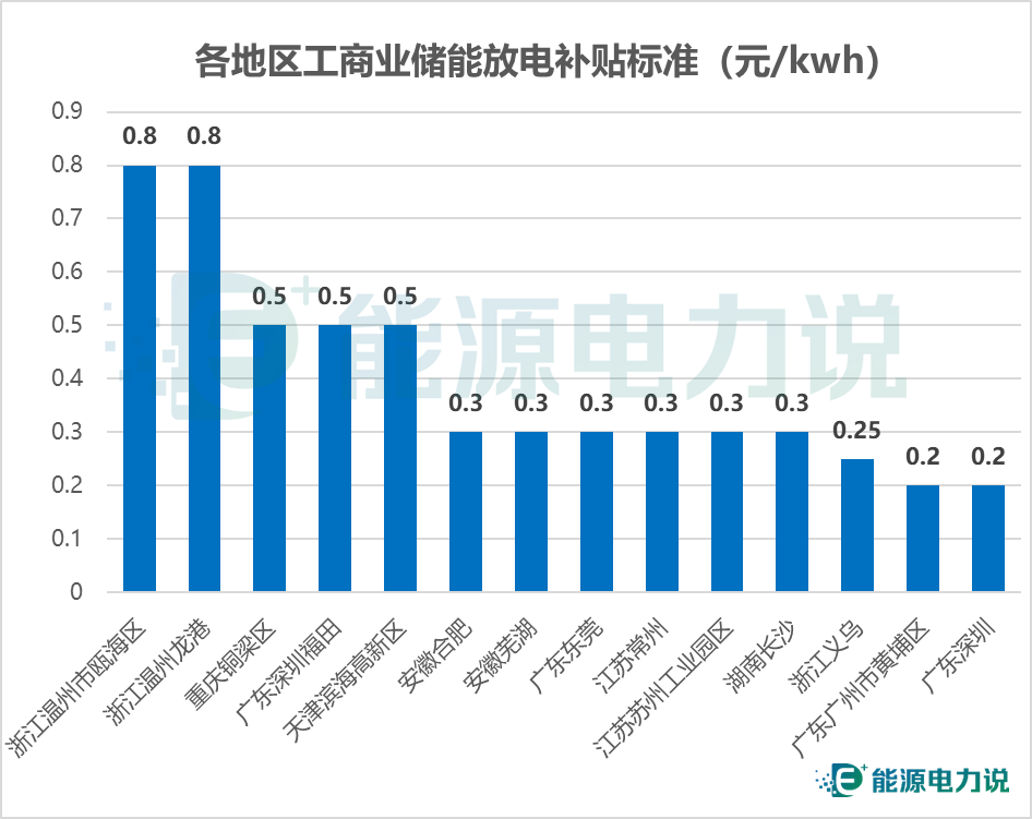 放電補貼方面,浙江溫州甌海區(qū)、龍港補貼標(biāo)準(zhǔn)最高,對投運的儲能項目按照實際放電量給予儲能運營主體0.8元/kWh的補貼;重慶銅梁區(qū)在補貼方面,對大于2MWh且年利用小時數(shù)不低于600小時,連續(xù)3年給予項目運營主0.5元/kWh的補貼;深圳福田、天津高新區(qū)濱海高新區(qū)對在區(qū)域內(nèi)投運的項目,0.5元/kWh的補貼。