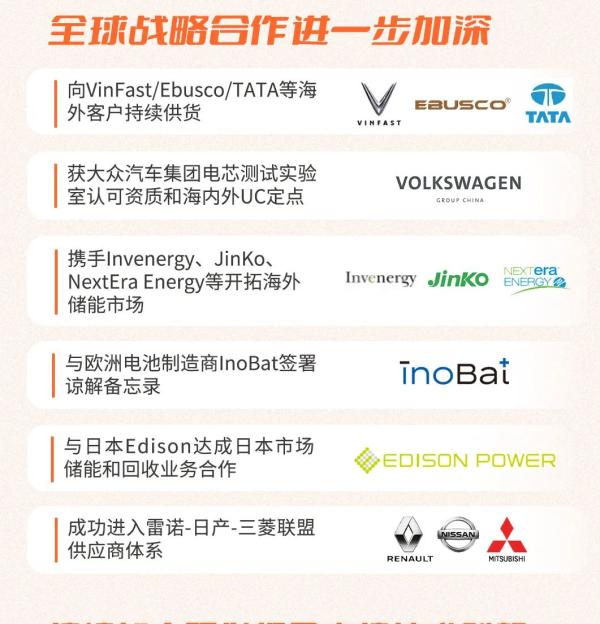 上半年,公司在歐美、東南亞、南美等地區(qū)新一代動力電池和儲能電池生產(chǎn)線以及在印尼、阿根廷、美國等地的原材料基地逐步走向落地;與歐洲動力電池制造商InoBat達成戰(zhàn)略合作,共同探索開拓歐洲市場;與易捷特戰(zhàn)略合作,進入雷諾-日產(chǎn)-三菱聯(lián)盟供應(yīng)商體系并供貨;還同越南車企VinFast共同打造越南首個磷酸鐵鋰電池制造工廠,加快布局東南亞市場。此外,公司與印度TATA、泰國Nuovo Plus、日本愛迪生能源等知名海外公司進行戰(zhàn)略合作。