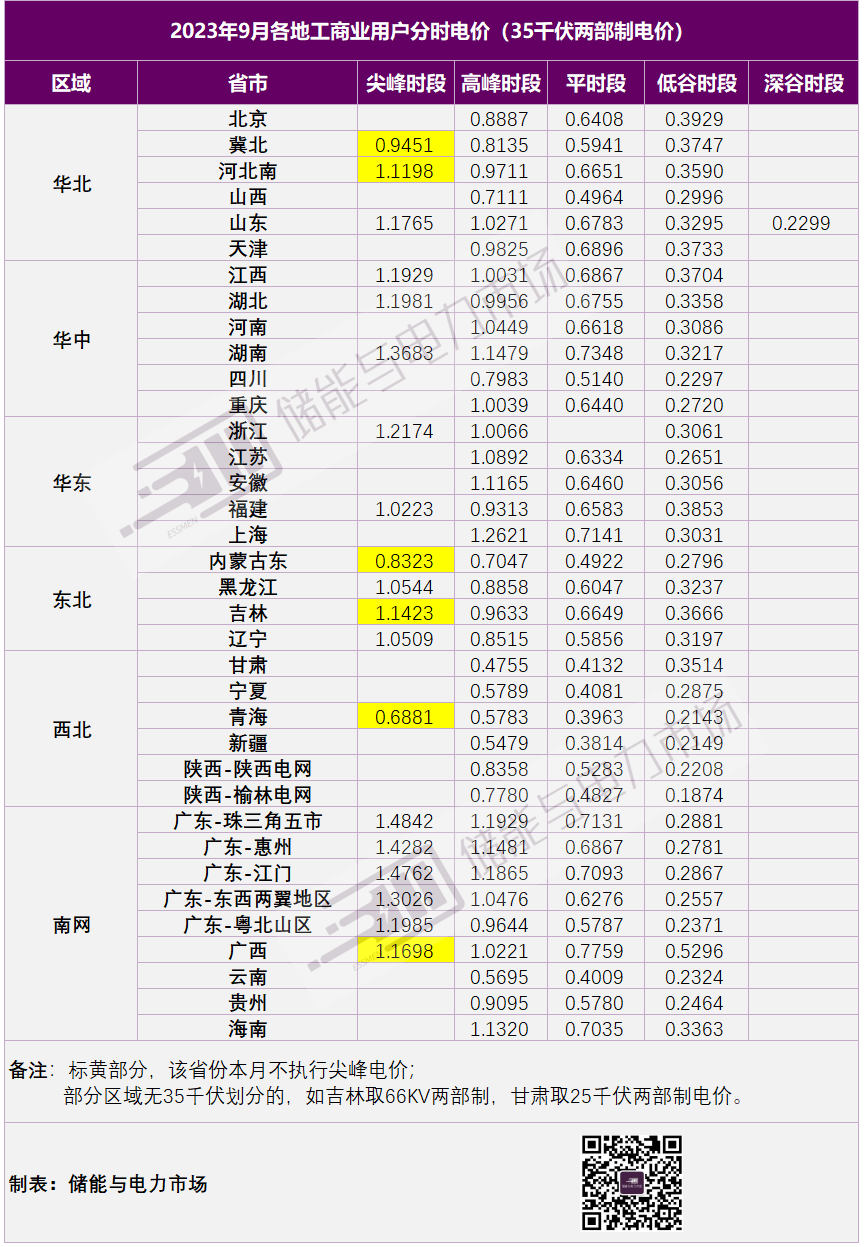 各區(qū)域2023年9月工商業(yè)用戶電價(jià)如下所示。
