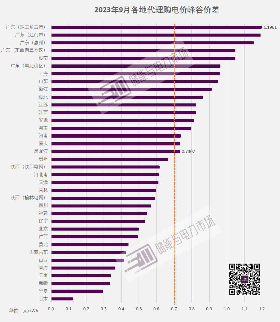 17個(gè)區(qū)域峰谷價(jià)差超過0.7元/kWh,廣東(珠三角五市、江門市、惠州市)峰谷價(jià)差排在前三,分別為1.1961元/kWh、1.1895元/kWh和1.1501元/kWh。