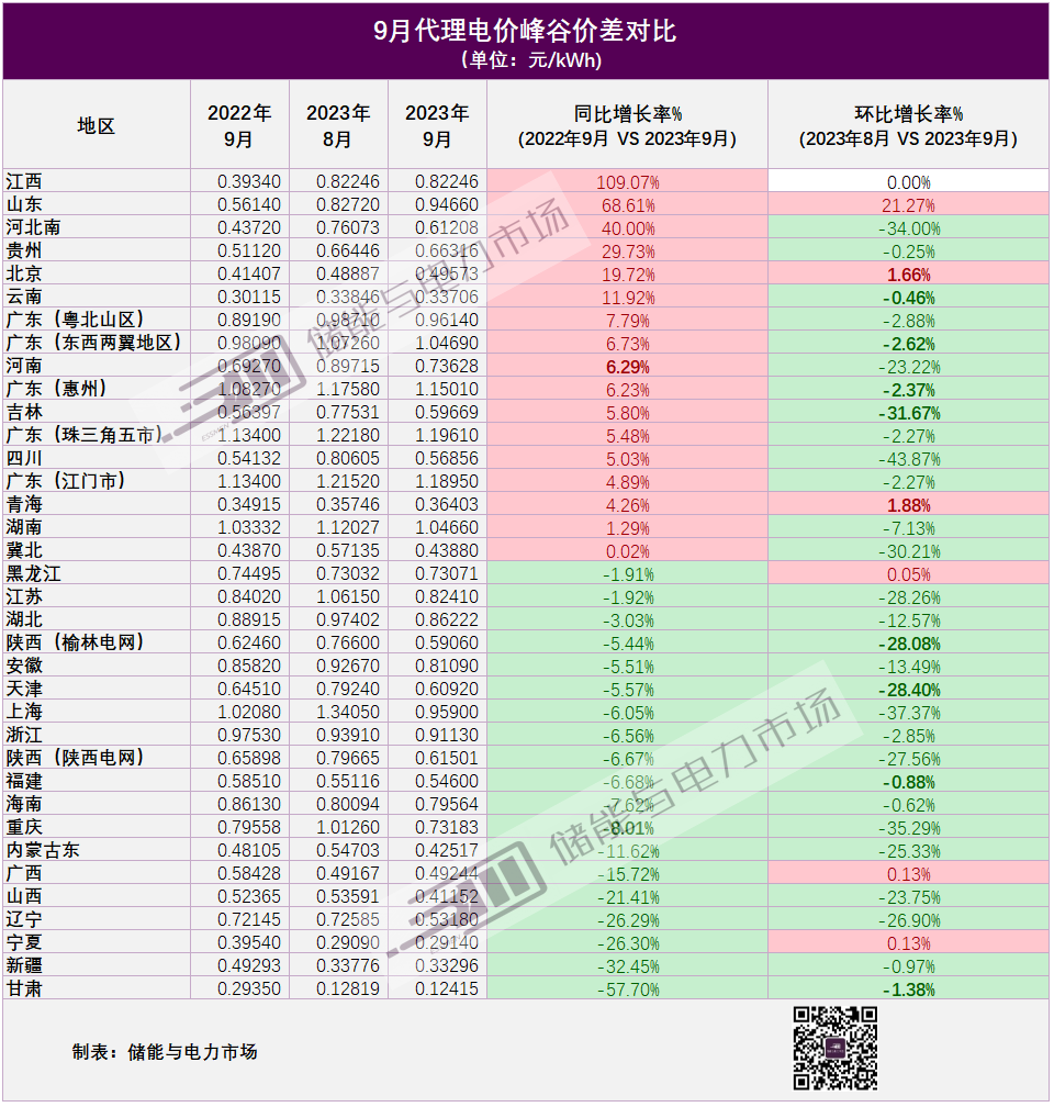 9月,不到5成區(qū)域峰谷價(jià)差同比增長。