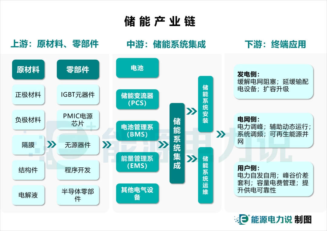 中國(guó)儲(chǔ)能網(wǎng)訊:從電化學(xué)儲(chǔ)能系統(tǒng)產(chǎn)業(yè)鏈來(lái)看,上游是電池原材料、電子元器件供應(yīng)商等;中游是儲(chǔ)能系統(tǒng)集成;下游應(yīng)用端則是風(fēng)光電站、電網(wǎng)系統(tǒng)、戶(hù)用/工商業(yè)、通信運(yùn)營(yíng)商、數(shù)據(jù)中心等終端用戶(hù)。一個(gè)典型的電化學(xué)儲(chǔ)能系統(tǒng)主要由電池、儲(chǔ)能變流器(PCS)、電池管理系統(tǒng)(BMS)、能量管理系統(tǒng)(EMS)四個(gè)核心部分構(gòu)成。