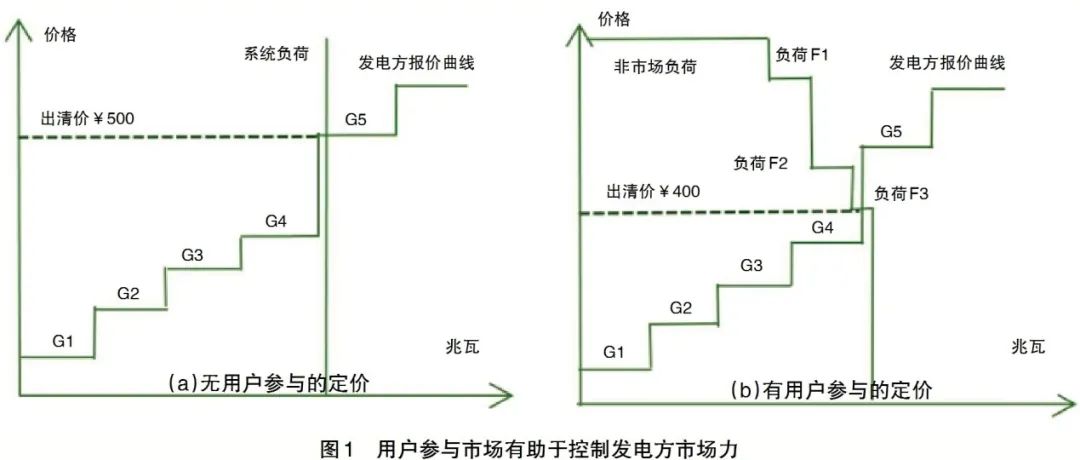 二是有助于控制發(fā)電方的市場(chǎng)力,降低用戶購(gòu)電成本。當(dāng)發(fā)電方要價(jià)過高時(shí),部分用戶可以降低負(fù)荷需求,平衡供需關(guān)系。如圖(a)所示,如果市場(chǎng)競(jìng)爭(zhēng)中沒有用戶直接參與,系統(tǒng)的需求曲線就是一條豎直的直線,市場(chǎng)出清價(jià)則由報(bào)價(jià)最高的邊際發(fā)電機(jī)組設(shè)定,邊際機(jī)組G5可以通過提高報(bào)價(jià)來提高市場(chǎng)出清價(jià),用戶只能作為價(jià)格接受者被動(dòng)接受市場(chǎng)價(jià)格,無法體現(xiàn)出用戶的交易意愿。但是如果用戶報(bào)價(jià)可以參與市場(chǎng)出清,如圖(b)所示,原來的邊際機(jī)組G5便無法中標(biāo)。市場(chǎng)出清價(jià)則由用戶F3來確定。G5如果想要中標(biāo),其報(bào)價(jià)就必須低于用戶F3。因此,因?yàn)橛杏脩鬎3的參與,G5的市場(chǎng)力得到了有效控制。