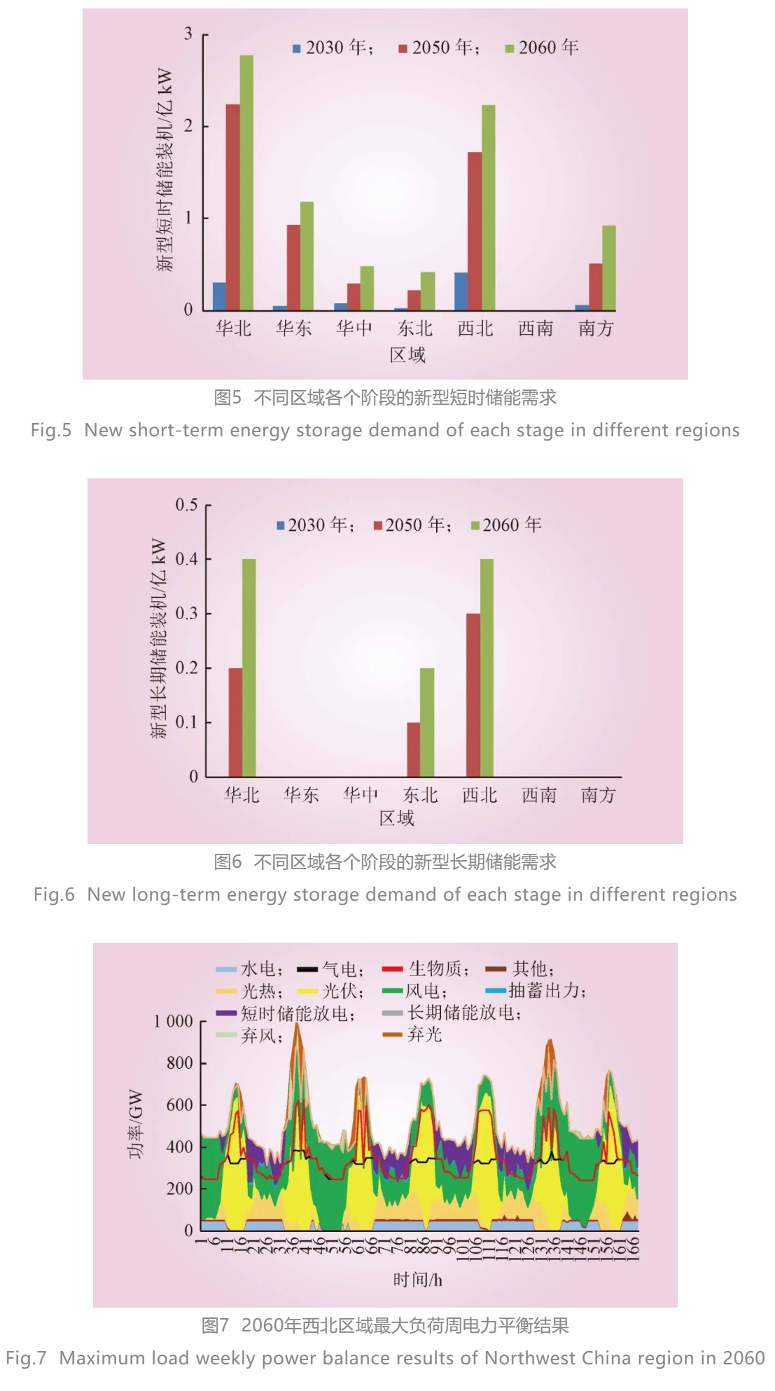 基準(zhǔn)方案下不同區(qū)域各個階段的儲能總需求、短時儲能需求、長期儲能需求以及2060年西北區(qū)域最大負(fù)荷周電力平衡結(jié)果如圖4~7所示。分區(qū)域來看,華北區(qū)域新能源裝機總量較高,出力波動明顯,與用電負(fù)荷需求不匹配,呈現(xiàn)強烈的反調(diào)峰特性,對儲能的需求較高。華東區(qū)域用電負(fù)荷較大,對用戶側(cè)靈活性調(diào)節(jié)資源的需求較大。華中區(qū)域水電等可調(diào)節(jié)電源占比較高,對新型儲能的需求相對較小。東北區(qū)域熱電聯(lián)產(chǎn)機組占比較高,靈活性調(diào)節(jié)能力相對有限,對儲能的需求較大。西北區(qū)域風(fēng)光新能源裝機占比高,在煤電裝機逐漸降低、水電基本開發(fā)完畢、核電開發(fā)受站址限制等條件下,對儲能的需求較大。西南區(qū)域水電裝機占比高,調(diào)節(jié)能力較為充足,對新型儲能的需求不大。南方區(qū)域用電負(fù)荷大,外受電比例高,區(qū)外來電的特性對電網(wǎng)的靈活性影響明顯,如果充分發(fā)揮云南等地的水電調(diào)節(jié)能力,可以顯著降低煤電需求。