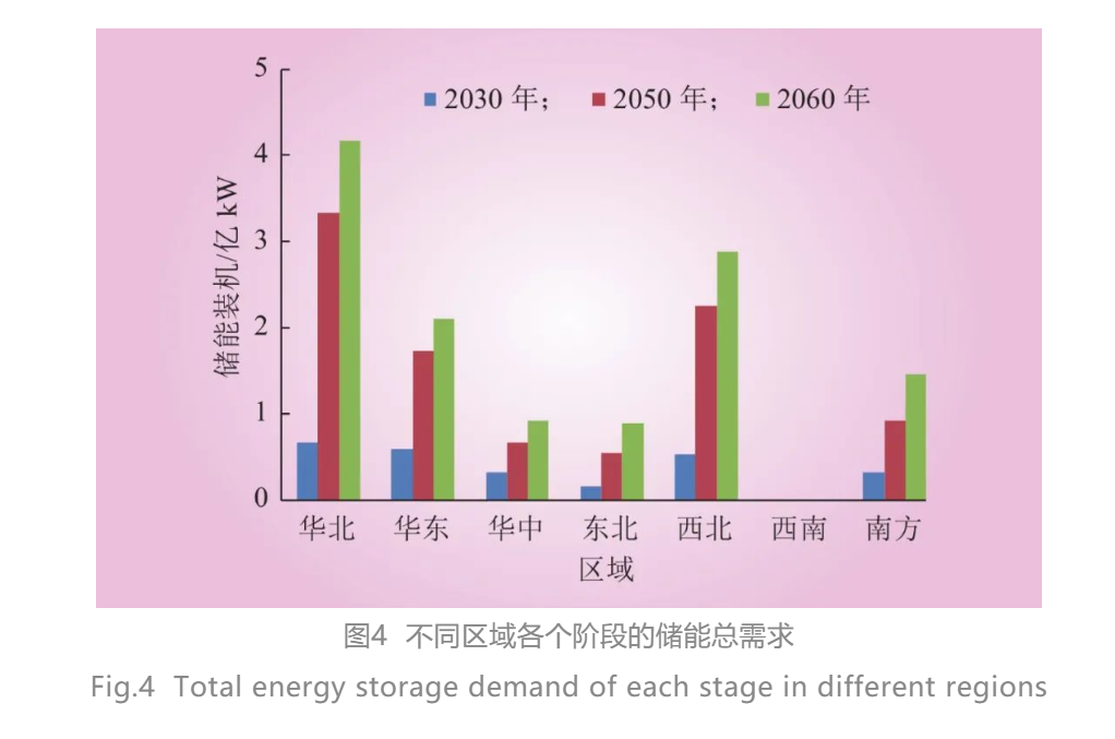 1)基準(zhǔn)方案下的儲能需求是統(tǒng)籌考慮系統(tǒng)技術(shù)經(jīng)濟性的最優(yōu)結(jié)果。預(yù)計2030、2050和2060年,中國新型儲能(不含抽蓄)需求分別為0.9億、6.5億、9億kW,其中長期儲能需求分別為0、0.6億和1億kW。分區(qū)域來看,西南區(qū)域?qū)π滦蛢δ苄枨笞钚?;華東、南方、華中3個區(qū)域僅對短時儲能需求較大;西北、華北、東北3個區(qū)域?qū)π滦投虝r儲能和新型長期儲能都有需求。