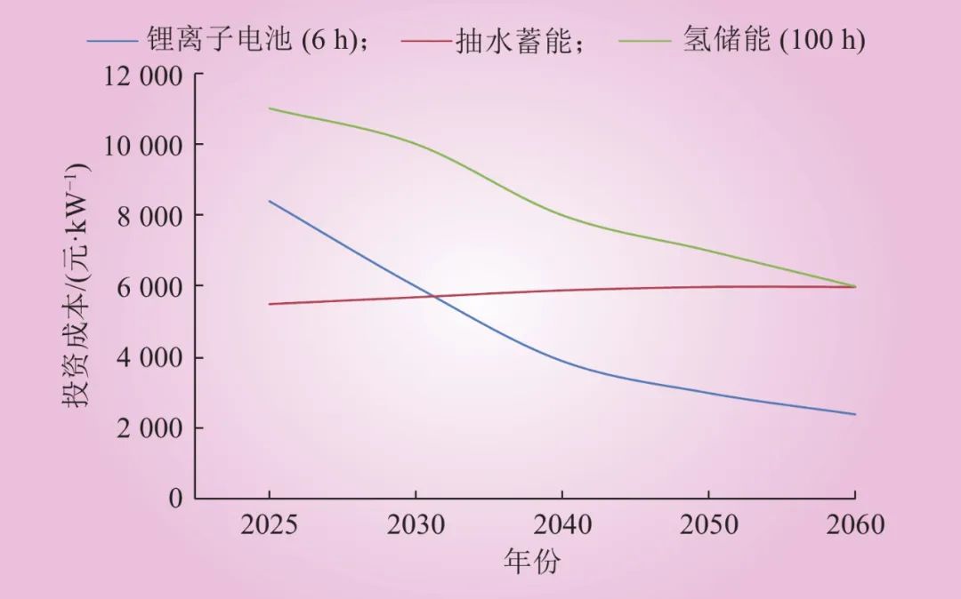 考慮短時功率型儲能和長期能量型儲能在電力系統(tǒng)中的不同作用,分別對2種儲能進(jìn)行建模和優(yōu)化計算。短時儲能主要考慮抽水蓄能和鋰離子電池(新型短時儲能),兩者分開建模,抽蓄持續(xù)放電時間按照6~8 h考慮,充放電效率75%,鋰離子電池持續(xù)放電時間按照4 h考慮,充放電效率85%,結(jié)合專項規(guī)劃,分析中不再對抽蓄規(guī)模進(jìn)行優(yōu)化;新型長期儲能參照包含電解槽、儲氫罐和氫發(fā)電設(shè)備的氫儲能系統(tǒng)為例,持續(xù)放電時間一般可達(dá)100 h,“電-氫-電”的充放電效率為50%。結(jié)合大規(guī)模儲能技術(shù)發(fā)展研究,以下給出不同類型儲能的投資成本變化趨勢[22-23],如圖3所示。