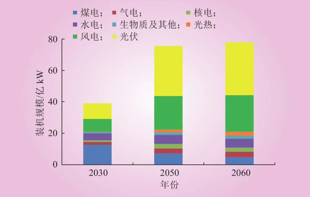 全面中和階段(2050—2060年),2060年電力生產(chǎn)90%以上由清潔電源供應(yīng),65%由新能源電源供應(yīng),碳捕集量約10億t CO2,進(jìn)入電力供應(yīng)負(fù)排放時代,為全社會2060年前碳中和提供負(fù)排放空間。