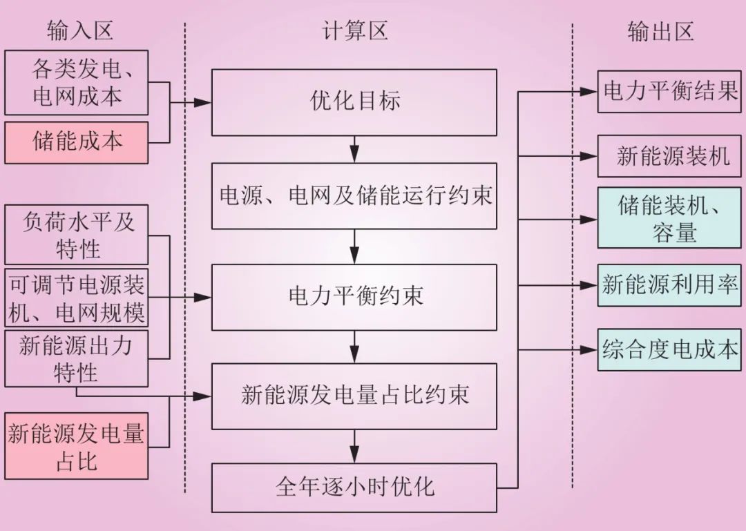 儲能需求優(yōu)化計算流程如圖1所示。首先,根據(jù)已有研究基礎(chǔ)確定各類輸入?yún)?shù),包括各類可調(diào)節(jié)電源出力特性、成本及規(guī)模,新能源出力曲線、成本及規(guī)模,電網(wǎng)輸電特性、成本及規(guī)模,儲能調(diào)節(jié)特性和成本,新能源滲透率以及供電充裕度等技術(shù)經(jīng)濟指標(biāo),具體參數(shù)詳見2.2節(jié)基礎(chǔ)邊界。其次,以確保用電可靠性為前提,結(jié)合各類電力、電量平衡約束,以綜合度電成本最低為優(yōu)化目標(biāo),采用混合整數(shù)線性規(guī)劃進(jìn)行建模,優(yōu)化系統(tǒng)8 760逐小時的運行過程;最終,得出滿足平衡要求的最優(yōu)儲能裝機、新能源裝機優(yōu)化結(jié)果,計算相應(yīng)的新能源利用率和系統(tǒng)綜合度電成本等參數(shù)。