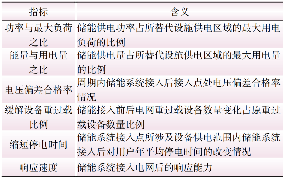 可以建立電網(wǎng)功能替代性儲(chǔ)能準(zhǔn)入評(píng)估指標(biāo)體系,作為準(zhǔn)入?yún)⒖?,但不同?yīng)用場(chǎng)景下準(zhǔn)入評(píng)估指標(biāo)設(shè)置的權(quán)重應(yīng)有所不同。評(píng)估指標(biāo)包括功率與最大負(fù)荷之比、能量與用電量之比、電壓偏差合格率、緩解設(shè)備重過(guò)載比例、縮短用戶停電時(shí)間、響應(yīng)速度等,如表2所示。