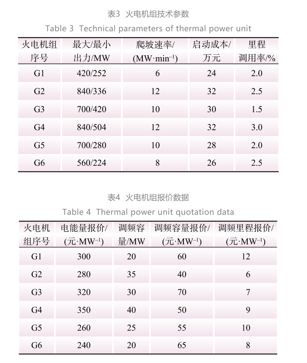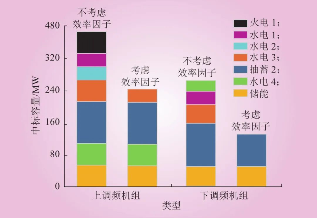 本文選取火電機組為傳統(tǒng)調(diào)頻資源,具有響應(yīng)幅度大、延續(xù)時間長特性;選取儲能為快速調(diào)頻資源,包括抽水蓄能、水電等,具有響應(yīng)變化幅度小、周期短、快速響應(yīng)特性。將2個交易品種面向調(diào)頻資源開放,實現(xiàn)以下優(yōu)勢。1)減少機組頻繁調(diào)節(jié)出力造成的壽命損失,儲能快速響應(yīng)調(diào)頻信號,解決調(diào)頻電量不足問題。2)較佳的調(diào)頻交易品種能以較小調(diào)頻成本實現(xiàn)最佳的調(diào)頻效果。3)引入效率因子后系統(tǒng)調(diào)頻容量需求減少,提升調(diào)頻效率,出清價格有明顯下降,且退出調(diào)頻輔助市場的資源還可運用在其他市場,實現(xiàn)資源節(jié)約。