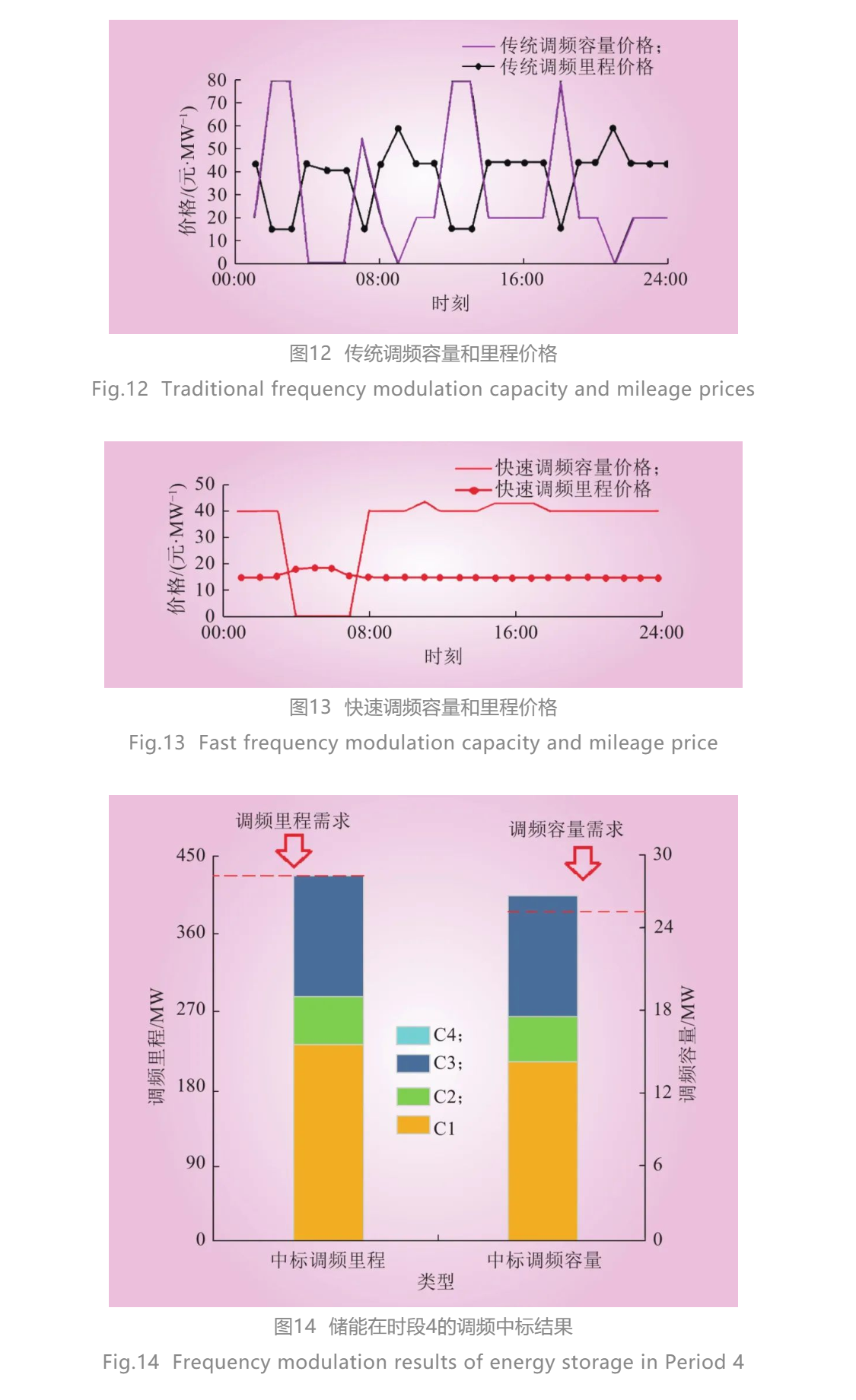 圖12~14為傳統(tǒng)、快速調(diào)頻容量和里程價格,以及儲能中標結(jié)果,由圖12~14可知,傳統(tǒng)調(diào)頻和快速調(diào)頻交易品種在04:00~06:00的容量價格為0,原因是此時段內(nèi)調(diào)頻容量需求較低、調(diào)頻里程需求較高。04:00~07:00內(nèi),儲能C1~C3中標調(diào)頻容量,中標容量大于實際需求時,系統(tǒng)調(diào)頻容量需求增加時并不需要儲能提高自身調(diào)頻容量,若系統(tǒng)僅調(diào)用對應(yīng)容量需求的調(diào)頻容量26.24 MW,因存在里程調(diào)用率限制,該部分調(diào)頻容量能提供最大調(diào)頻里程為410.5 MW,無法滿足調(diào)頻里程需求420 MW,從而需額外的調(diào)頻容量提供調(diào)頻里程,快速調(diào)頻交易里程價格約為17元/MW,與圖13結(jié)果一致。