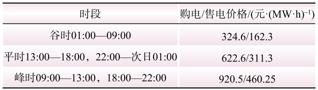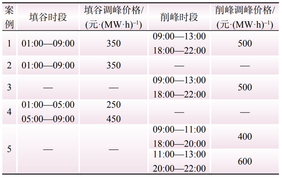 VPP在峰谷電價進行電能量市場購售電;儲能與柔性負荷來參與調(diào)峰,在01:00—09:00可參與填谷調(diào)峰,在09:00—13:00和18:00—22:00可參與削峰調(diào)峰,設(shè)定5種案例來進行算例分析。
